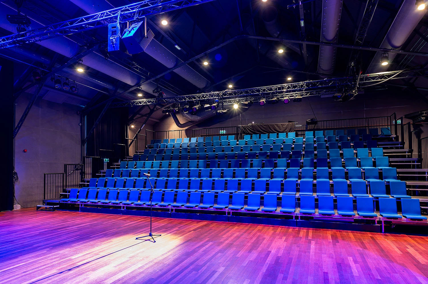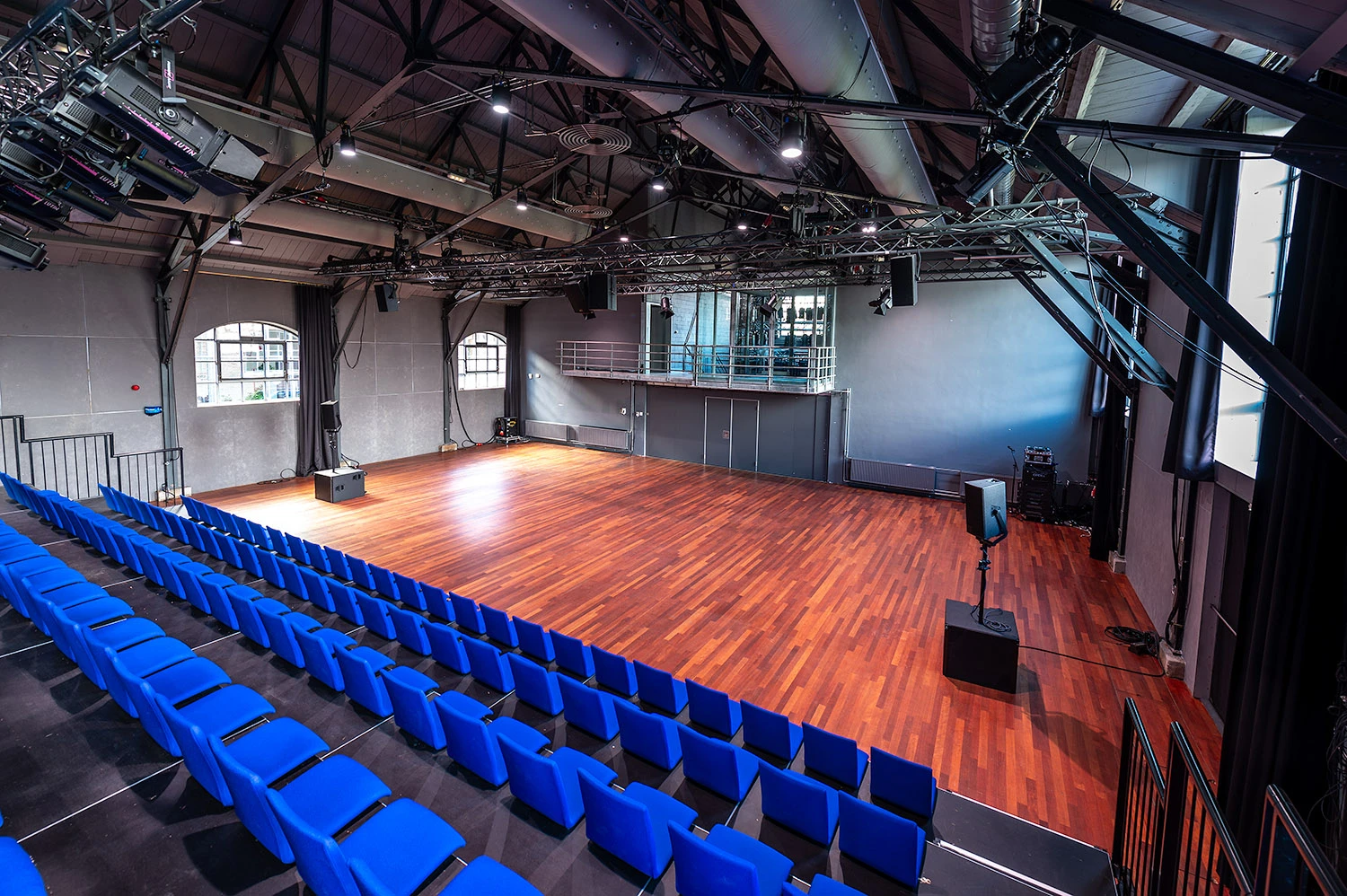 De theaterzaal is bruto 16 meter breed, 11 meter diep en 5 meter hoog op het laagste punt (puntdak) de zaal heeft een tribune die in basis plaats heeft voor 180 bezoekers.